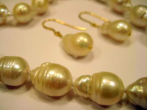I think you'll love this "fireball" baroque pearl necklace & earring set with 18K gold earring findings and 14K gold clasp.
