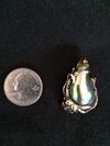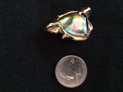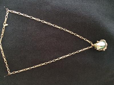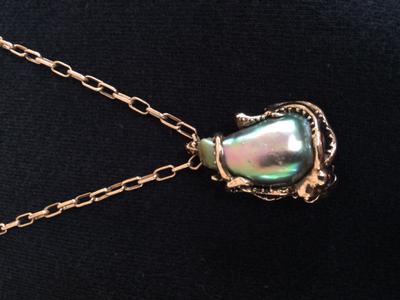 My husband was an urchin diver in the 1970’s. Once in a while he brought abalone home for dinner. One evening he brought a red abalone from the Channel Islands. While cleaning it, a pearl dropped out. I kept the pearl in my jewelry box for over 30 years. I decided to have it set so I sent it to David Stein at the Offwhite Gallery in Avalon on Catalina Island. I asked him to cast a 24k gold octopus holding the pearl. I also asked him to make a gold chain. I did not weigh the pearl before it was set. The total weight of the piece is 113.4 karats, or 22.68 grams.
