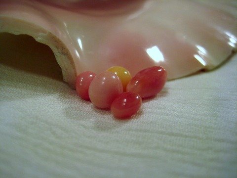 Enjoy my conch pearl photos of five colorful conch pearls in various shapes and colors.