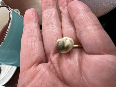 After a busy day of running our dog to the vet, and driving to and from Seattle. We stopped for lunch. I ordered fried oysters ad I have many times but this time one of the oysters I bit into felt like I had a mouth full of marbles. This huge one and a couple very tiny ones. I left the tiny ones but brought home this large one. It’s not very pretty. Thankfully my tooth is fine.?