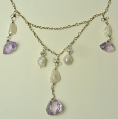 Whilst on a recent buying trip visiting a midland fair I found a most interesting and pretty necklace that consists of a handmade chain though intricately made with silver gilt wire certainly by an amateur hand. There are five short lengths of chain hanging from the main chain and each of these contains a Mississippi pearl (I am getting pretty good at spotting them now) the largest is approx. 10mm the smallest 7mm. Three of the pearls also have facet cut natural amethysts suspended below the pearls. I love this simply made necklace; it conjures up romantic notions that it was made by the person who first found the pearls.
