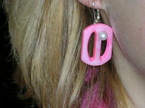 Another removable pendant made from A gorgeous pink carved pearl button. Matching earrings available. It took several steps to make a carved button like this involving lots of hand work