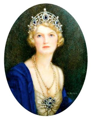 The first member of the family who was depicted wearing the tiara was Winifred’s daughter-in-law, Ivy. An ivory miniature of Ivy, then the Marchioness of Titchfield, shows her wearing the tiara and a coordinating sapphire and diamond devant de corsage.