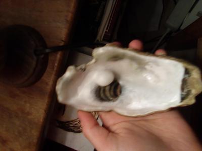 je l'ouvre avec difficulté et me rend compte qu'elle est diforme..je la mange ..délicieuse..et je garde la coquille en main,c'est la que je me rend compte qu'il s"agit d'une perle blister énorme..