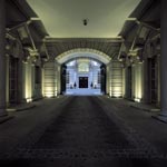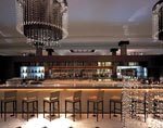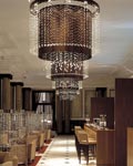 At the same time, the ceiling of the Pearl Restaurant is listed, which meant that only the eight existing suspension points could be used for lighting. To provide supplementary illumination, stainless steel and frosted glass up lights have been attached to the screens; their art deco shape echoing the style of the faux alabaster bowl fittings throughout the hotel were specially commissioned from lighting designer Berners and are a suitable scale theatrically to complement the grandeur of the original Edwardian building. The faux alabaster dish lights, found in the bar area of the restaurant are matched by pendant fittings in the real alabaster in the corridors. The magnificent mahogany door case at the courtyard entrance to the bar is a prominent feature of the listed exterior.