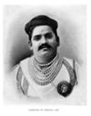 The Maharaja of Palanpur sits on a wooden chair dressed in an achkan, with